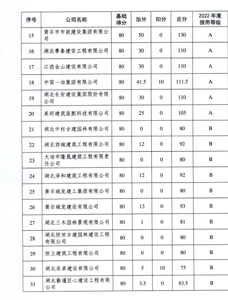 集團公司被黃石市住建局評為建筑市場主體信用A級單位