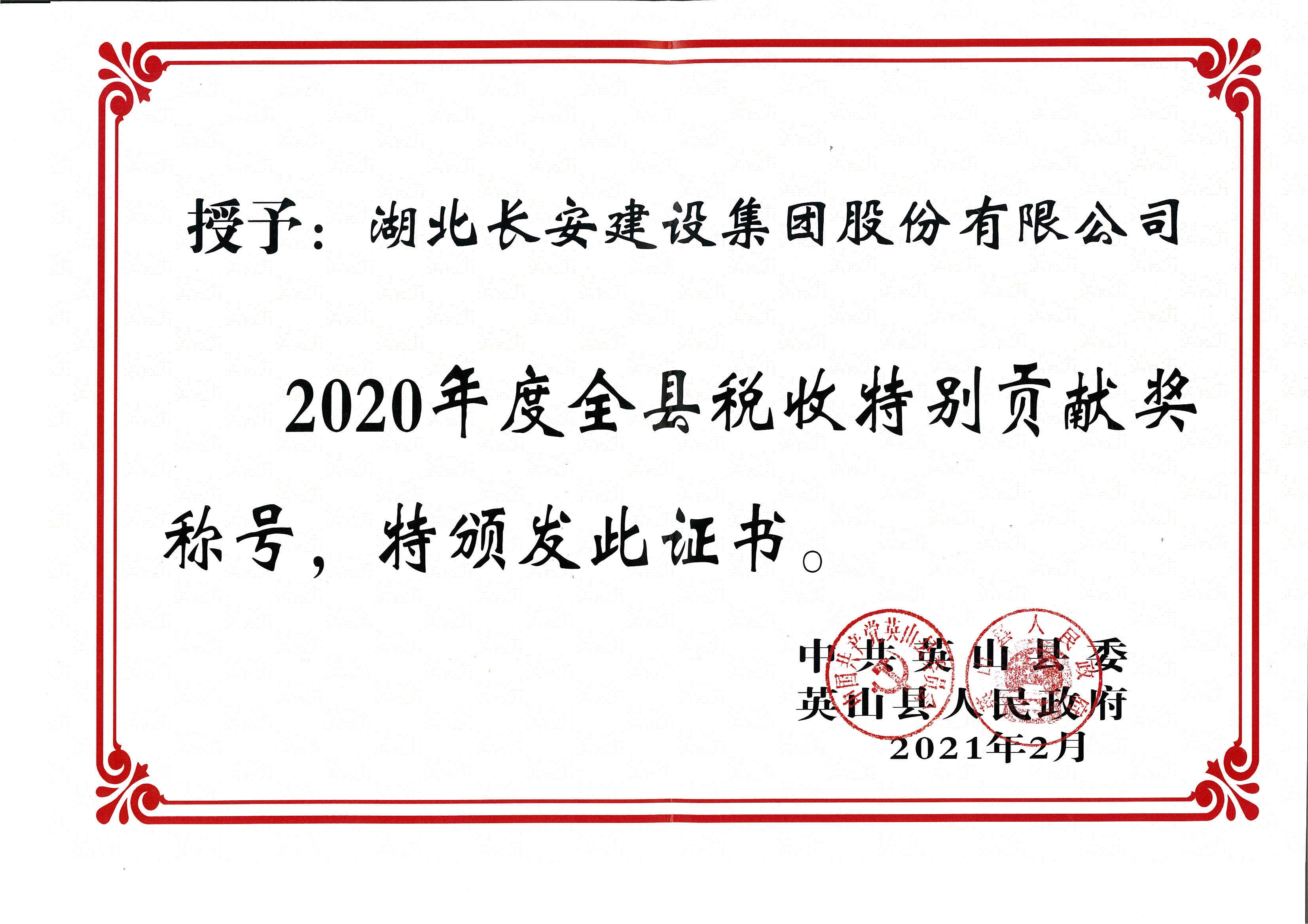 集團(tuán)被英山縣人民政府授予“稅收特別貢獻(xiàn)獎(jiǎng)”企業(yè)榮譽(yù)稱號(hào)