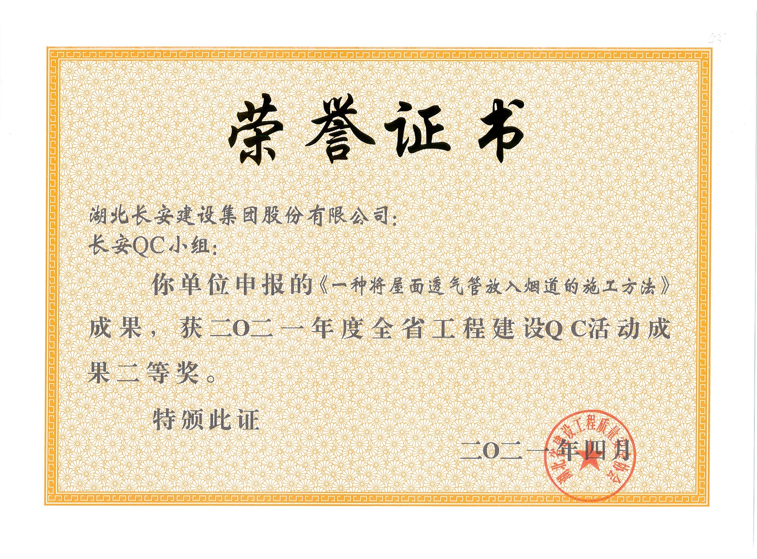 長(zhǎng)安QC小組成果——《一種將屋面透氣管放入煙道的施工方法》榮獲2021年度省QC成果二等獎(jiǎng)