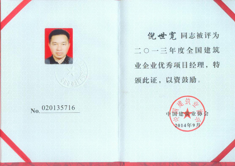 2013年度全國建筑業(yè)企業(yè)優(yōu)秀項(xiàng)目經(jīng)理(倪世寬)