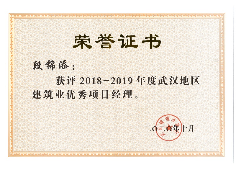 段錦添、胡衛(wèi)星、張明、徐勇剛、余建兵獲評(píng)2018-2019年度武漢地區(qū)建筑業(yè)優(yōu)秀項(xiàng)目經(jīng)理