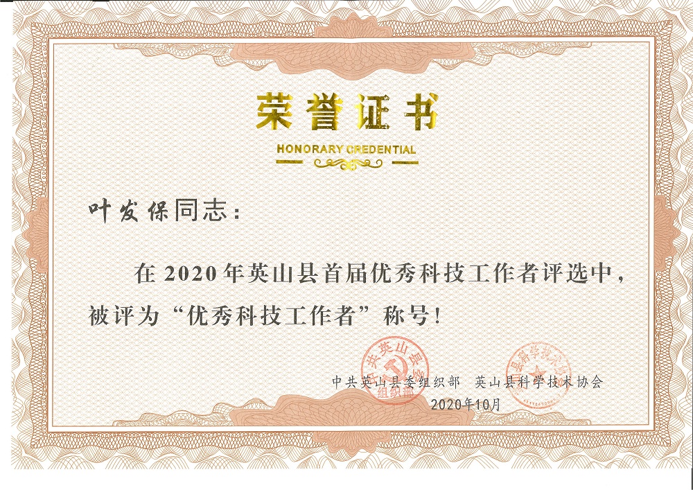 總經(jīng)理葉發(fā)保榮獲“英山縣首屆優(yōu)秀科技工作者”稱號(hào)