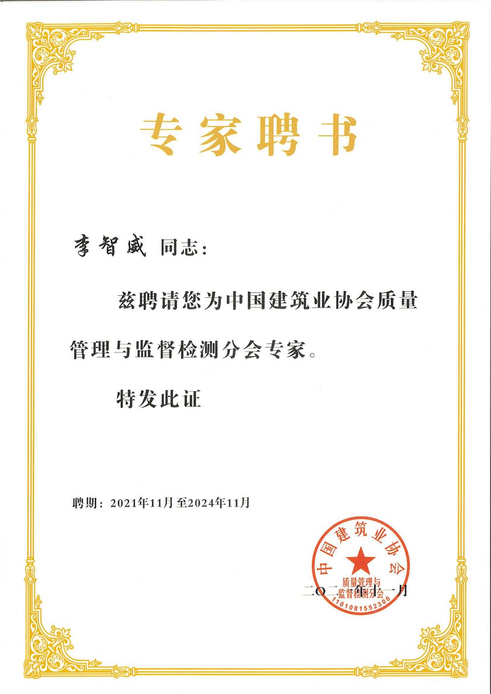 李智威被聘為中國建筑業(yè)協(xié)會(huì)質(zhì)量監(jiān)督檢測(cè)分會(huì)專家