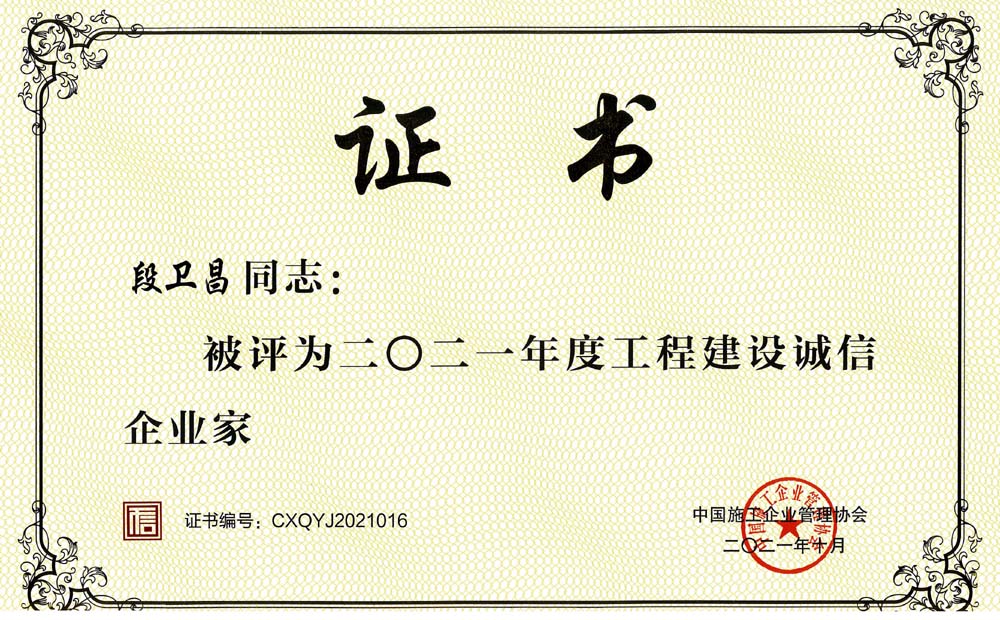 段衛(wèi)昌榮獲2021年度工程建設(shè)誠信企業(yè)家稱號(hào)