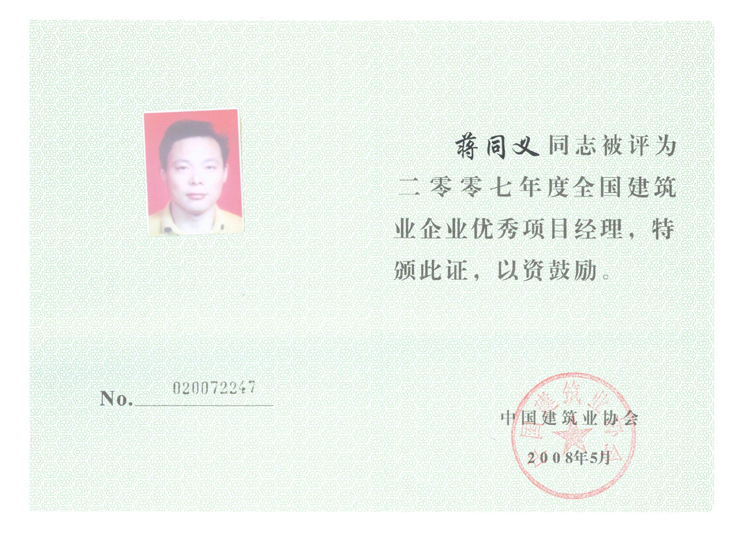 2007年度全國(guó)建筑業(yè)企業(yè)優(yōu)秀項(xiàng)目經(jīng)理(蔣同義)