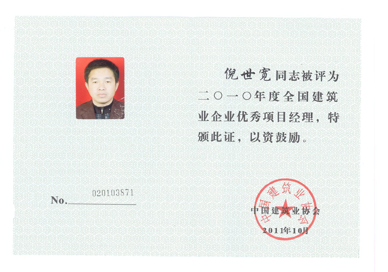 2010年度全國(guó)建筑業(yè)優(yōu)秀項(xiàng)目經(jīng)理(倪世寬)