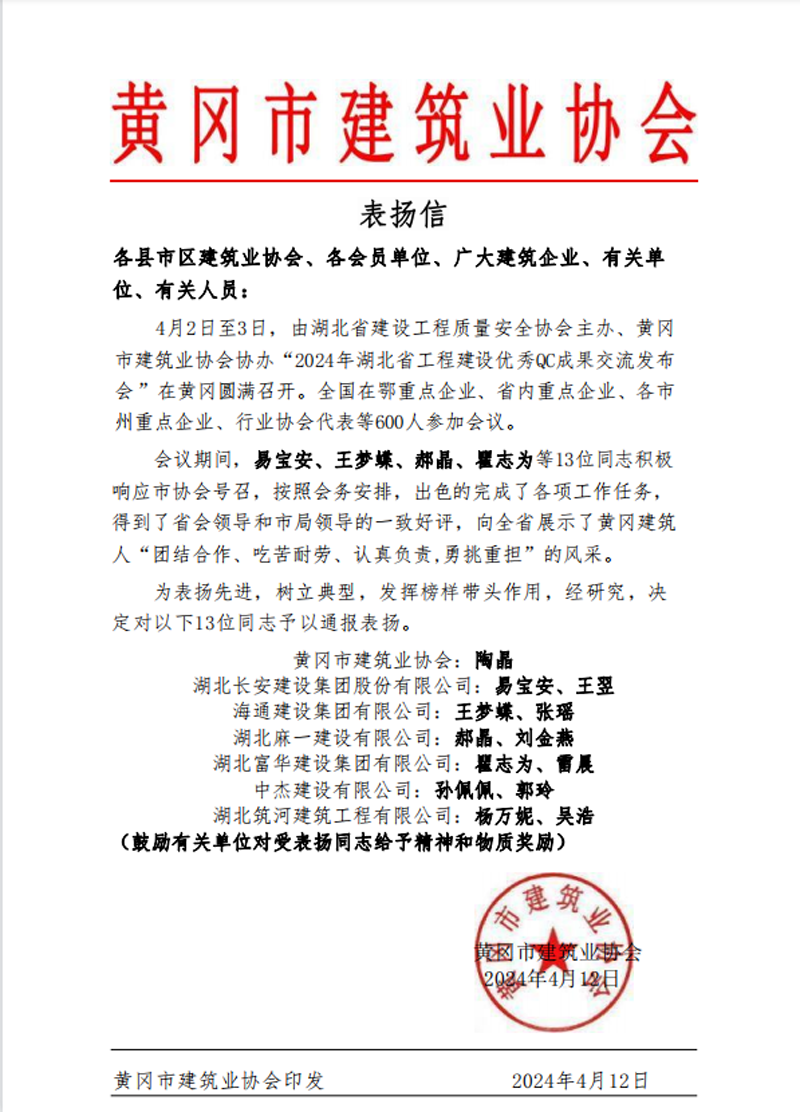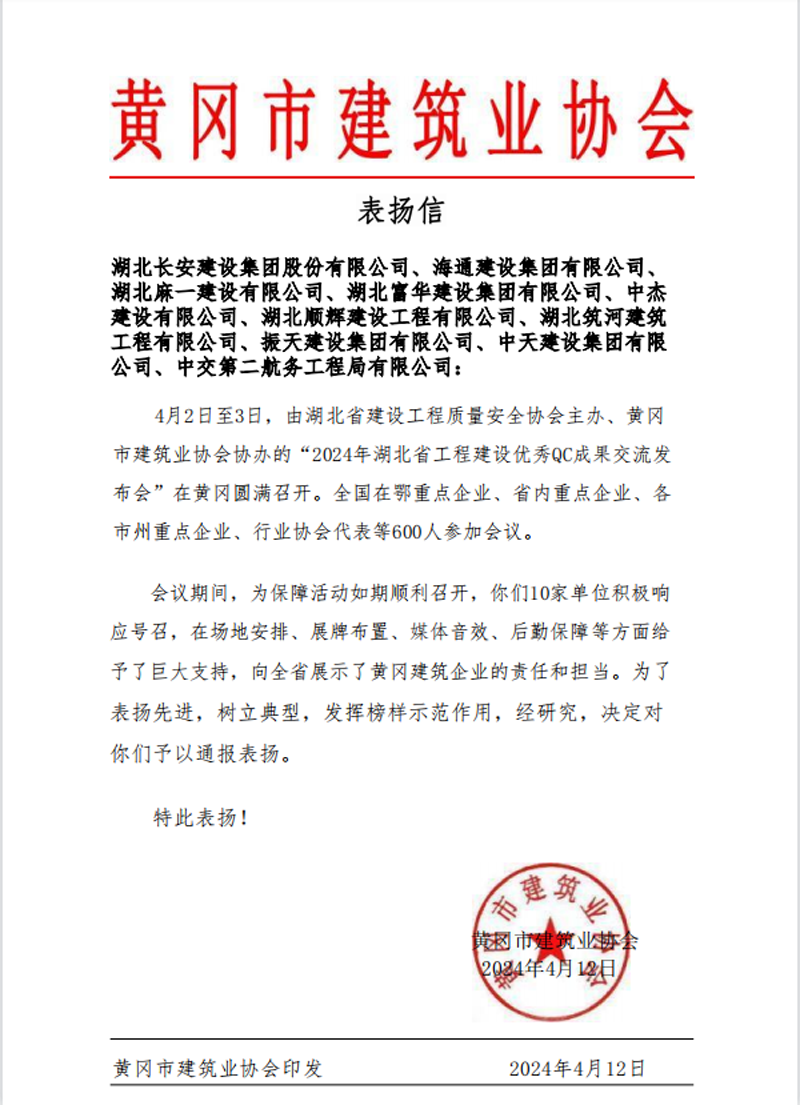 2024年湖北省工程建設(shè)優(yōu)秀QC成果交流發(fā)布會(huì)圓滿落幕--省建設(shè)工程質(zhì)量安全協(xié)會(huì)、黃岡市建筑業(yè)協(xié)會(huì)致集團(tuán)公司及個(gè)人的表?yè)P(yáng)信