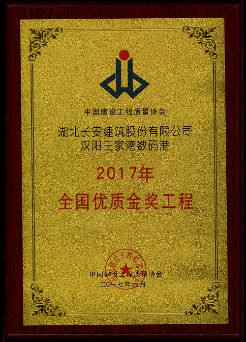 漢陽王家灣數(shù)碼港工程被評(píng)為“2017年全國(guó)優(yōu)質(zhì)金獎(jiǎng)工程”獎(jiǎng)牌