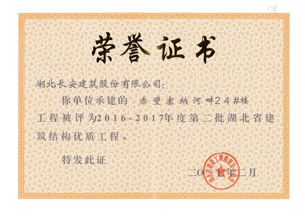 赤壁塞納河畔二期24#樓被評(píng)為2016-2017年度第二批湖北省第二批省結(jié)構(gòu)優(yōu)質(zhì)工程([2017]4號(hào))