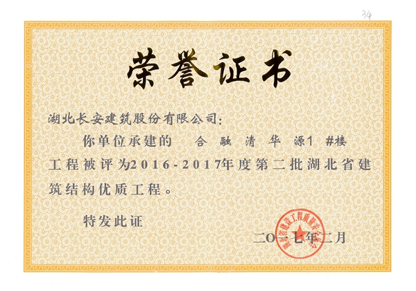合融清華1#樓被評(píng)為2016-2017年度第二批湖北省第二批省結(jié)構(gòu)優(yōu)質(zhì)工程([2017]4號(hào))