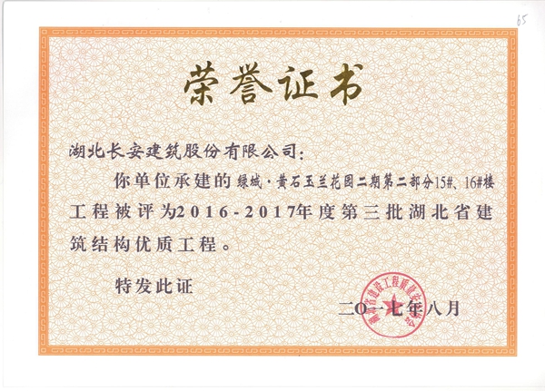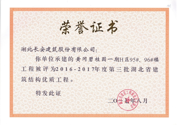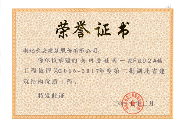 黃岡碧桂園一期F區(qū)92#樓評(píng)為2016-2017年度第二批湖北省第二批省結(jié)構(gòu)優(yōu)質(zhì)工程([2017]4號(hào))