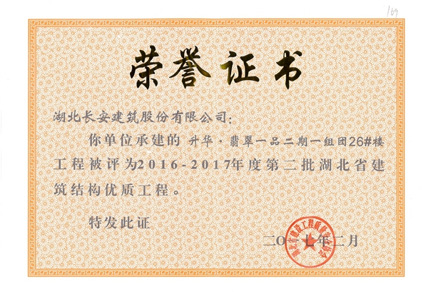 升華翡翠一品二期一組團(tuán)26#樓評(píng)為2016-2017年度第二批湖北省第二批省結(jié)構(gòu)優(yōu)質(zhì)工程([2017]4號(hào))