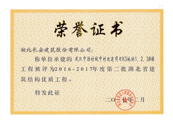 武漢中勝村城中村改造項(xiàng)目K3地塊1、2、3#樓被評(píng)為2016-2017年度第二批湖北省第二批省結(jié)構(gòu)優(yōu)質(zhì)工程([2017]4號(hào))