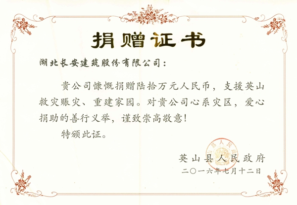 60萬元抗洪救災(zāi)捐贈證書2016