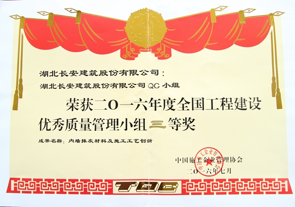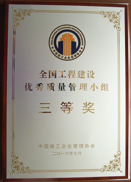 公司及QC小組榮獲2016年度全國工程建設(shè)優(yōu)秀質(zhì)量管理小組三等獎(內(nèi)墻抹灰材料及施工工藝創(chuàng)新)獎牌