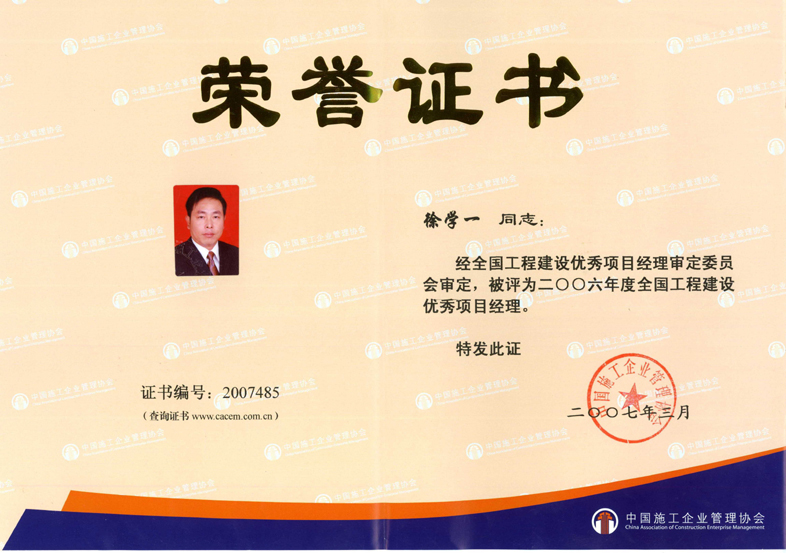 2006年度全國工程建設(shè)優(yōu)秀項目經(jīng)理(徐學(xué)一)