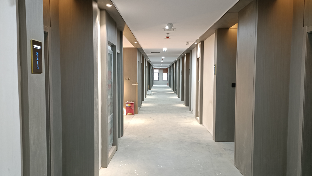 該隔離點(diǎn)搶建工程共計(jì)6層,總建筑面積6600m2,而且時(shí)間緊、任務(wù)重、裝修檔次較高。設(shè)計(jì)內(nèi)墻涂料、木飾面板、墻布、軟包、壁畫(huà)、硬包、不銹鋼線(xiàn)條、木門(mén)、防火門(mén)、復(fù)合地板、人造石、淋浴房、開(kāi)關(guān)、燈具、潔具、消防、電視、監(jiān)控等,點(diǎn)多面廣,綜合管理難度較大。項(xiàng)目各班組采取晝夜連續(xù)施工的方式,加緊建設(shè)。長(zhǎng)安建設(shè)集團(tuán)積極整合資源,組織200余名精干職工從早晨6;00--晚上23:00不間斷施工,確保原約定2個(gè)月完成的施工任務(wù)在短短的10天內(nèi)保質(zhì)保量完成。