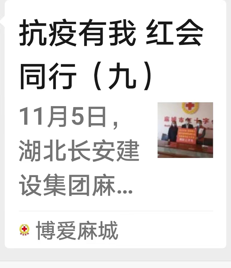 11月5日,湖北長安建設(shè)集團(tuán)麻城分公司向市紅十字會捐贈抗疫捐款三萬元。市委統(tǒng)戰(zhàn)部副部長、市工商聯(lián)黨組書記、常務(wù)副主席項(xiàng)慶華參加捐贈活動。