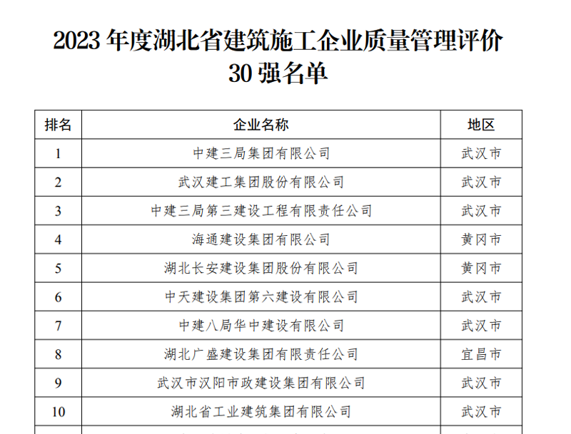 日前,湖北省建設(shè)工程質(zhì)量安全協(xié)會(huì)官網(wǎng)發(fā)布了《關(guān)于公布2023年度湖北省建筑施工企業(yè)質(zhì)量管理評(píng)價(jià)30強(qiáng)名單的通知》,湖北長安建設(shè)集團(tuán)股份有限公司在30強(qiáng)中排名第5位,比上一屆上升4位。