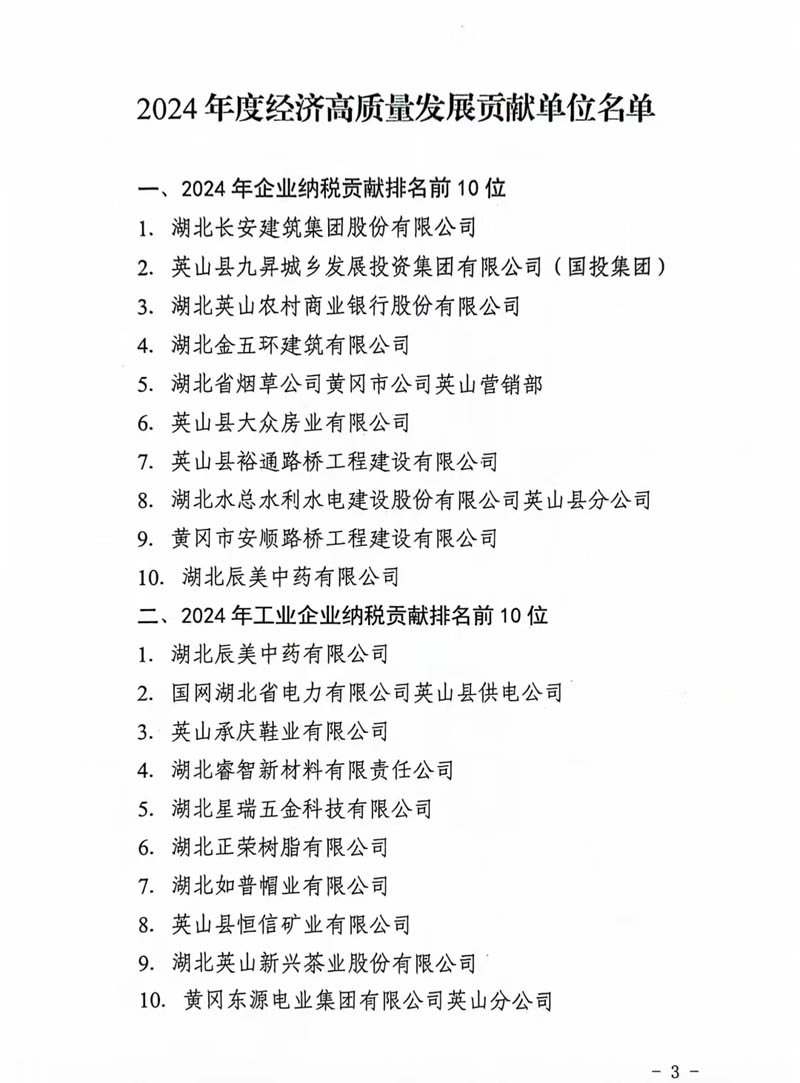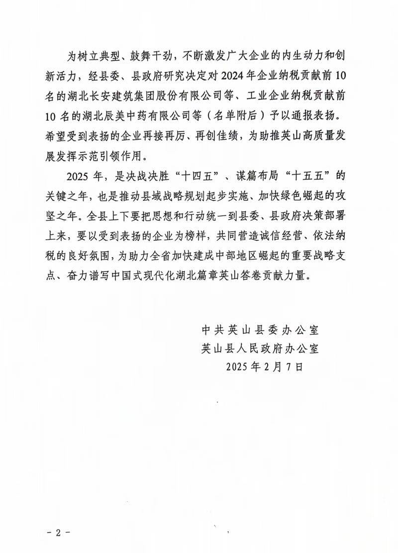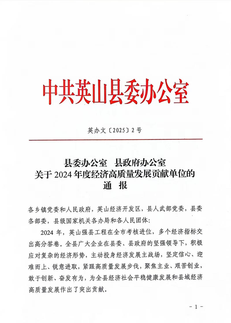 2月10日,英山縣2025年三級干部會議在英山縣禮堂召開。集團公司榮庸“2024年度經(jīng)濟高質量發(fā)展貢獻單位”稱號,在“2024年企業(yè)納稅貢獻排名前10位”中榮居第1位。