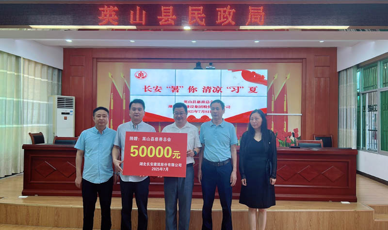 7月8日上午酷暑炎炎,“長安‘暑’你 ,清涼‘習’夏”捐贈儀式在英山縣民政局舉行。長安建設集團公司向英山縣慈善總會捐款50000元,為孔家坊鄉(xiāng)王家畈村委會留守兒童(暑期)學校購置空調,改善和提高學生的學習、生活環(huán)境。集團公司行政副總石柱(左2)、項目經理段國昌(右2)參加捐贈儀式并現(xiàn)場捐款。