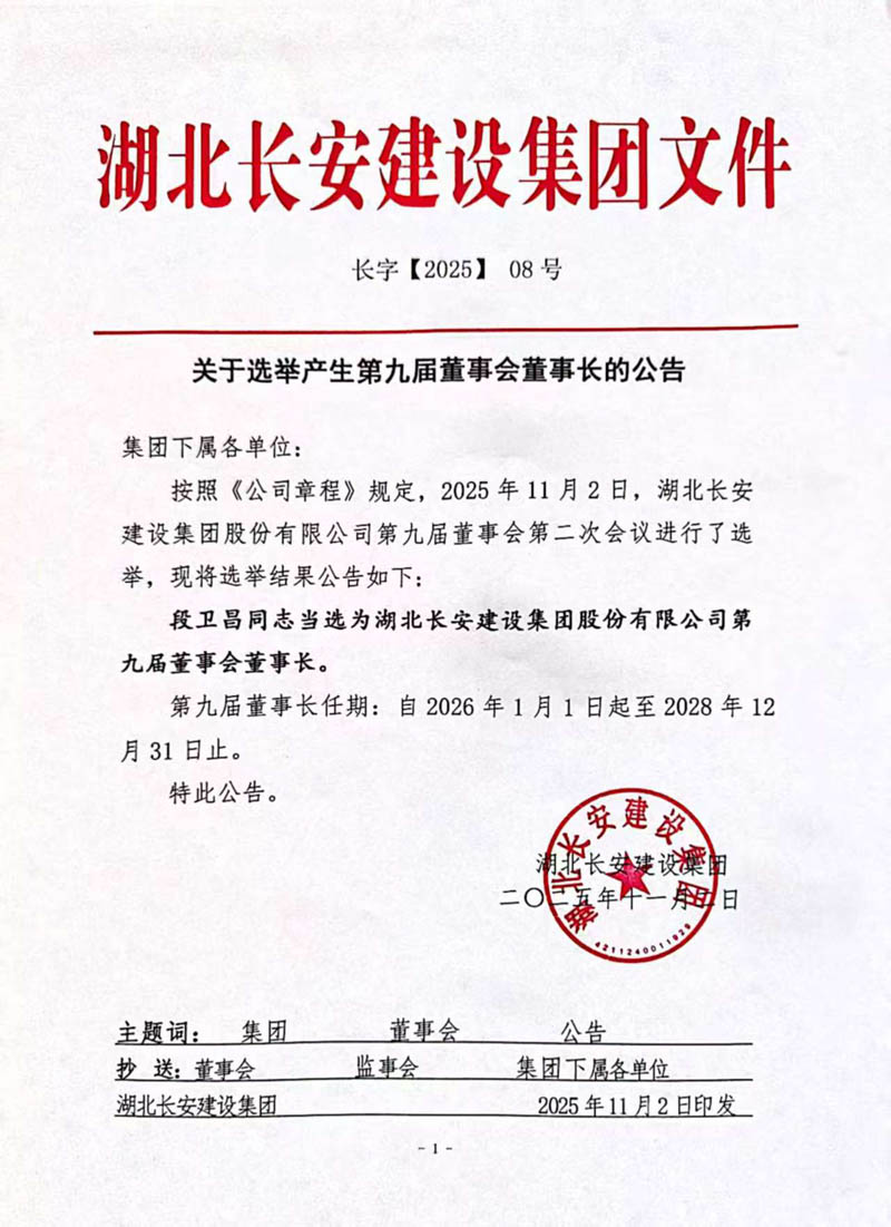 依據(jù)《湖北長(zhǎng)安建設(shè)集團(tuán)股份有限公司章程》規(guī)定,2025年11月2日,經(jīng)湖北長(zhǎng)安建設(shè)集團(tuán)股份有限公司第九屆董事會(huì)第二次會(huì)議選舉,段衛(wèi)昌同志擔(dān)任湖北長(zhǎng)安建設(shè)集團(tuán)股份有限公司第九屆董事長(zhǎng)。任期:自2026年1月1日起至2028年12月31日止。